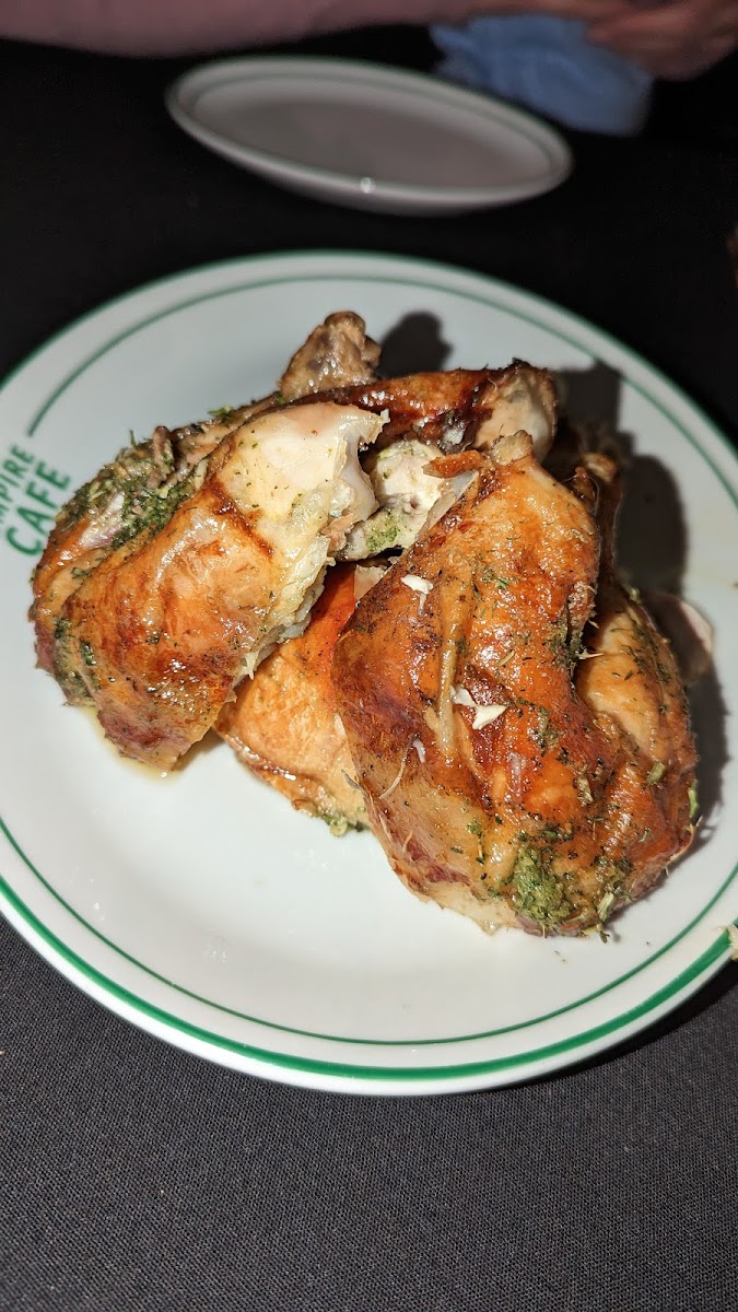 This is a terrific place to go visit just for their gorgeous rotisserie chicken. It has a small, very cosy, inside seating area where you can sit next to the open kitchen, drooling at the chicken you're about to order. Another seating area downstairs (no where near as cosy) and a few tables outside, great for when the weather's good. Best chicken I've had in the city. Highly recommend.
